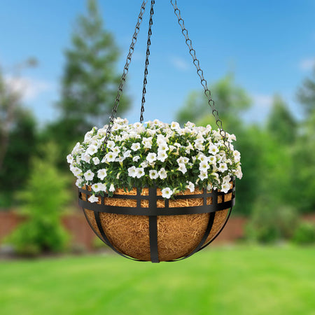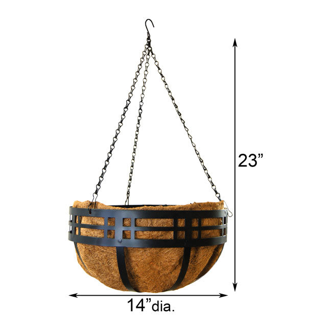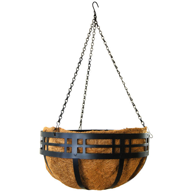 Match your planting area to your home's design with this Panacea Black Mission Hanging Basket. Flat steel slats and rectangular openings near the top of the frame contrast the basket's circular shape, and curved slats leading to a bottom disc complete the unit. An included coco liner ensures the black frame remains visible, and helps keep your soil and plants contained. This liner also aids in retaining moisture, and the 14" diameter open top handily showcases plenty of blooms. Three, 16" long chains attach to the frame, and the top S hook makes it easy to hang the planter. Its steel body lasts for many seasons of use, and its powder coated finish protects the item from the elements. Add an architectural hint to your patio or backyard with this Black Mission Hanging Basket.