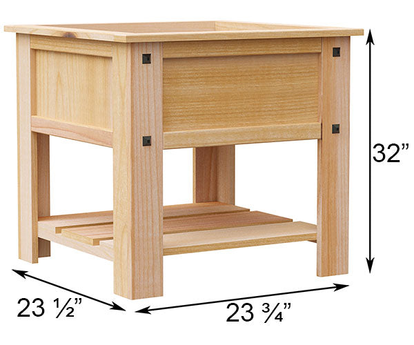 Add height and recognizable style to your planting area with this Panacea Tan Mission Raised Cedar Planter Bed. This free standing, square unit brings natural elements to the forefront of your patio or garden, while wonderfully supporting a few plants or herbs. A fabric liner sits inside the 9.5" deep, top reservoir, perfect for keeping soil contained and holding a flowering plant easily. Four legs create a stable support for this piece, and pyramidal metal accents on each further the Mission motif. A slatted shelf beneath the reservoir offers storage and stability, and the planter's tan tone and visible wood grain enhance its rustic appeal. The western red cedar body naturally repels insects and rot, and a wider top slat offers a finished look to the unit. Place a specific herb or vegetable growing area on your patio or deck using this Tan Mission Raised Cedar Planter Bed. Made in the USA. Some assembly required.