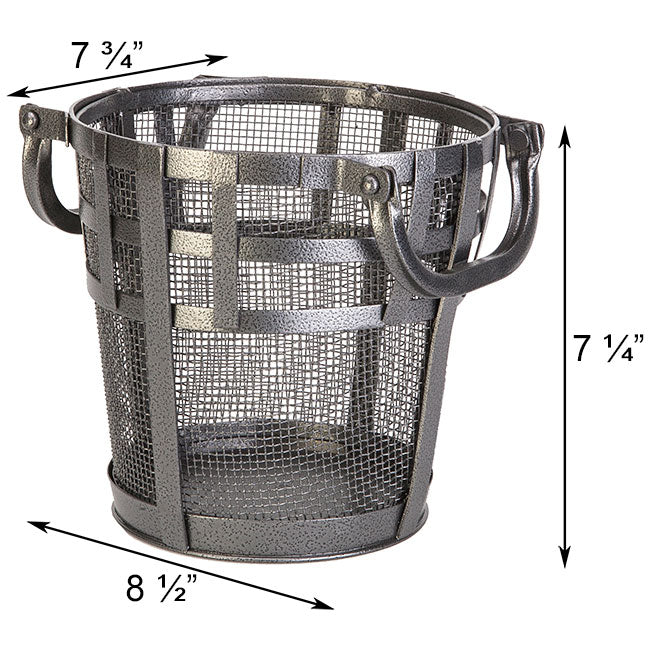 Keep small fire logs and kindling within easy reach of your hearth using this Panacea Gray Modern Prairie Fatwood Basket. The open top, mesh body, and metal support grid create a contemporary look on this piece, while the rustic shape adds a bit of contrast. The flat, 5.625" diameter base of the item sits on a level surface easily, supporting the mottled gray, metal uprights which complete the frame. A 0.125" square mesh forms the sides of the reservoir, and the open top makes it simple to reach your kindling. Two handles near the top of the unit enhance the rustic effect, and make it easy to move the item. The overall gray hue and mottled finish offer an aged look on this bin, and its compact size makes placement simple. Add your kindling to your hearth in this Gray Modern Prairie Fatwood Basket.