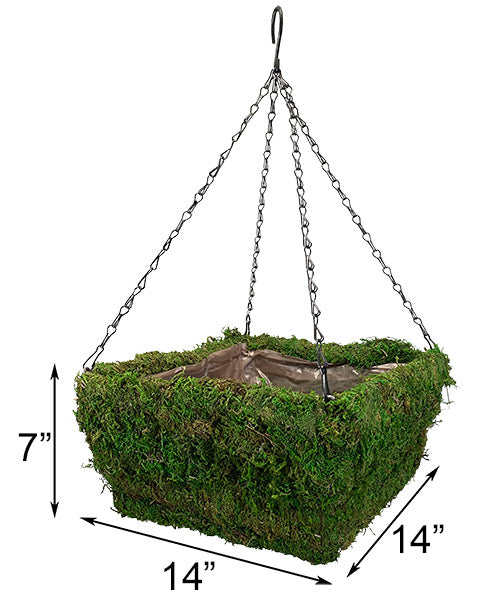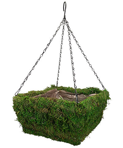 Double the greenery on your patio or in your flowerbed with this Panacea Green Natural Moss Square Hanging Basket. Adding flowers or herbs to a hanging basket allows you to customize their growing environment, and is perfect for keeping naturally spreading plants contained. A unique, green moss fully covers the exterior of this metal frame, and its varied green hues bring a bright look to any setting. Black, metal chains connect to each corner of the planter, with a top "S" hook making it easy to hang the item. A plastic liner inside the basket keeps soil, water, and plants in place, and can be removed and replaced with a different liner seasonally. The curls and waves of the moss covering contrast the square basket for a bold garden addition, and the verdant tones offer brightness. Make flora a centerpiece of your patio or yard using this Green Natural Moss Square Hanging Basket.