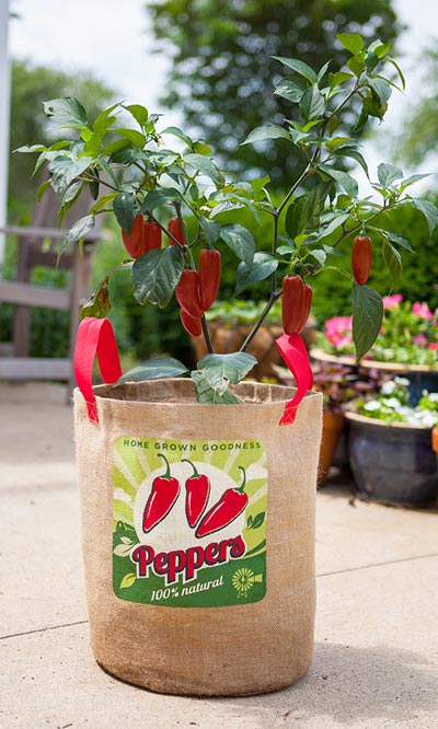Bring lively color and a favorite crop to your deck by placing this Panacea Peppers Grow Bag on it. This colorful, burlap vessel handily creates planting room in a compact space, allowing you to grow your own produce even without a yard. Vivid, red peppers in front of a green field add a bright hint to this piece, perfectly enhancing its nostalgic look. The coated interior helps the burlap sack retain water, and a grommet on the base provides drainage. Reinforced seams offer strength to the piece when filled with soil, and top handles make it easy to move the planter. The unit folds flat for convenient, seasonal storage, and looks great displayed on your deck or in your sunroom. Create a freestanding spot for helping pepper or tomato plants thrive with this Peppers Grow Bag.
