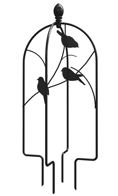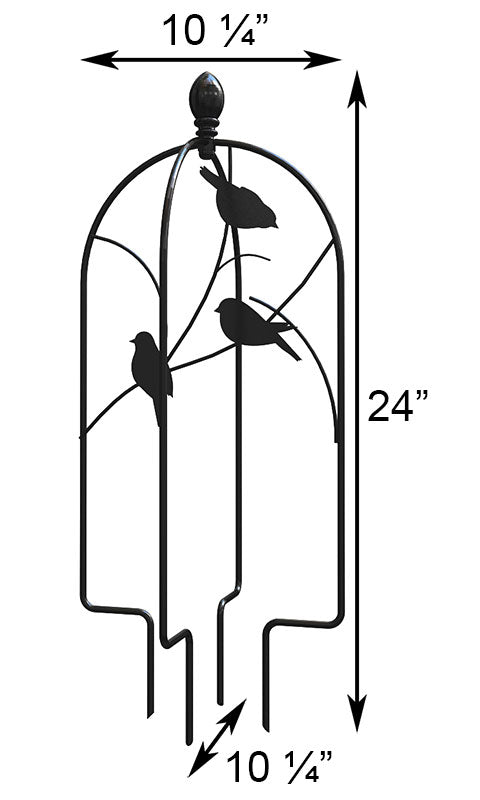 Showcase birds around one of your favorite potted plants using this Panacea Black Perching Birds Folding Pot Trellis. This unique, dual arch inserts into a 6" diameter or larger pot, and surrounds a small flower for a bold look. Thin metal rods affix to one arch panel, accommodating the three metal bird silhouettes to enhance the motif. A rounded finial keeps the two arches adjoined, while allowing you to place them perpendicularly to gracefully curve over the plant. The black color of this trellis contrasts your blooms or herbs, and its all metal construction remains durable season after season. Add lovely songbirds to your home or deck using this Black Perching Birds Folding Pot Trellis.