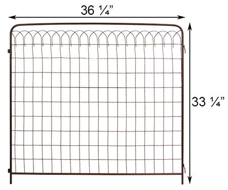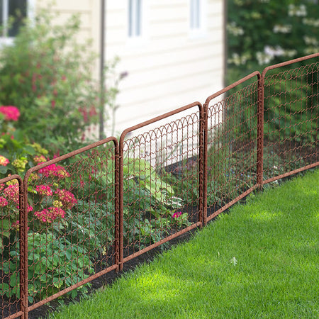 Create a beautiful and significant border in your landscaping using this Panacea Rustic Heirloom Cottage Garden Fence. Slightly rounded corners and overlapping, interior arches on each of these metal panels lend gentle style to your landscaping, while the generous size of each keeps the border nicely visible. Interior, rectangular openings throughout the body enhance the barrier, and the brown finish meshes with the outdoors. Metal pegs on one end of each section insert into loops on the following piece, forming an interlocking line, and this package of 12 panels covers quite a bit of area easily. Stakes and extended rods attach to the two legs on each panel, helping stabilize them once installed. Crafted from metal, these units add a classic look to your yard easily, and the wavy design of each rod adds visual interest. Stylishly divide your yard using these Rustic Heirloom Cottage Garden Fence panels.