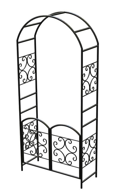 Create an elegant entry to your backyard or garden with the Panacea Scroll Arbor with Gate. Using an arbor in your lawn not only adds drama and height; it also separates it into distinct areas for a fantastic garden or retreat. Sections of scrollwork on each of the two side panels lend wonderful shape to this unit, complementing the gentle top arch. Additional scrollwork and arched tops on the 27.5" tall, center gate add more style to this piece, while horizontal support bars along the top and sides offer strength. The black color enhances your garden, and the steel construction ensures a lasting piece. Its powder coating withstands exposure to the elements, while the legs keep the item stable in your yard. Its side panels can also support climbing plants, for a unique garden centerpiece. Make a grand statement in your backyard with this Scroll Arbor with Gate. Assembly required.