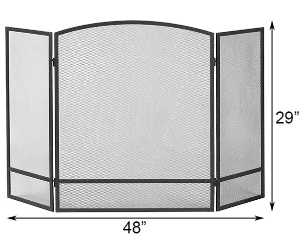 Keep your home safe and warm with the Panacea Three Panel Arched Firescreen with Bar. This versatile, lightweight fireplace screen from the Open Hearth Collection features three powder-coated, black matte finished panels. The 11.75" side panels are hinged to a 24" slightly arched center panel, making it capable of adjusting to almost any size fireplace opening. An additional horizontal bar placed 5" above the base offers ornamentation and stability for the item. The size 6 mesh screen protects your hearth from flying embers. This fully assembled fireplace screen will complement any decor and folds flat for seasonal storage. Don't let sparks escape from your fireplace with the Panacea Three Panel Arched Firescreen with Bar.