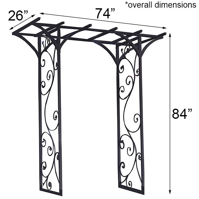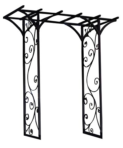Create a beautiful and tranquil sanctuary in your yard with the Panacea Vine Arbor. The refined style of this arbor will surely make a grand statement as your guests pass through it into your yard. Refined scrollwork forms vines and tendrils on each side panel, blending nature with this manmade ornament. Strong angles on the roof of the arbor contrast the curves of the vine pattern for even more visual interest. This arbor is ideal for supporting vines, climbing plants, or for hanging your decorative items. Simply train your plants by weaving them in and out of the arbor to create your own unique, dynamic design. The steel construction will withstand even the harshest climates, and its black, powder coated finish will enhance any décor. Bring elegance into your secret garden with the Vine Arbor. Assembly required.