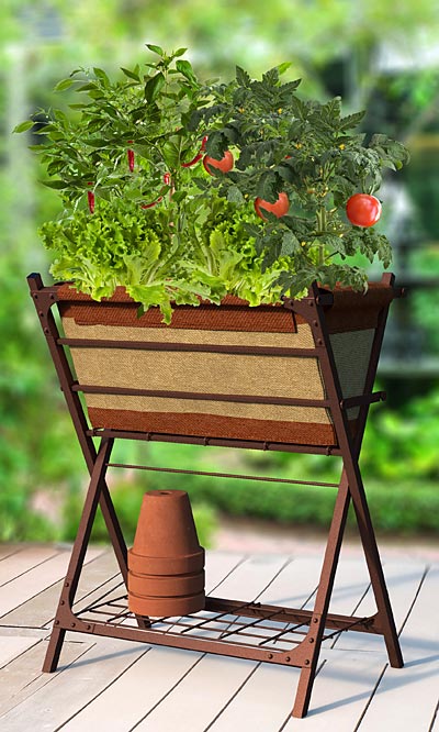 Grow seasonal vegetables in a small space easily using this Panacea Vintage Grow Bag Patio Planter and Stand. The convenient, steel frame, burlap bag, and brown tones of this piece bring a vintage look to your patio or deck with ease, while offering plenty of planting area for a few herbs or crops. Crossing legs on the brown, steel stand create a fun silhouette, and a mesh shelf at the base easily holds a few pots or some potting soil. An included, burlap bag attaches to the top of the stand, and Velcro strips keep it securely in place. A plastic lining on the inside of the bag prevents water from saturating the burlap, and drainage holes at the bottom complete the piece. The varying brown tones offset the greenery of your plants, and the unit folds for seasonal storage. Turn a bit of your deck into a small garden with this Vintage Grow Bag Patio Planter and Stand. Some assembly required.
