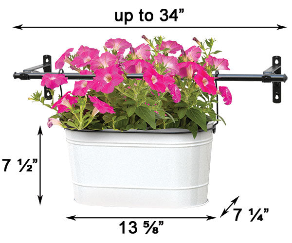 Dimensions: 13.625"L x 7.25"W x 7.5"H planter, 26" to 34"L mounting rod