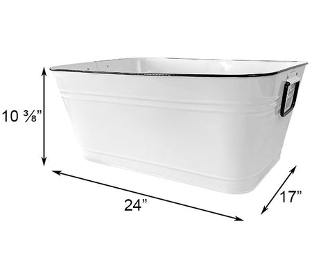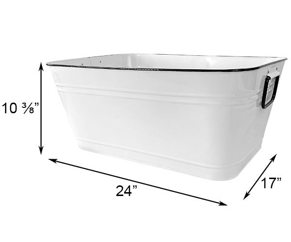 Showcase plants or decor with crisp and traditional style using this Panacea Vintage Milkhouse Washtub Style Planter. This sturdy, rectangular steel unit not only provides planting space; its open body also acts as a versatile storage bin or a touch of outdoor style. The white finish throughout the rectangular piece adds a bright look, while 3 horizontal, raised lines throughout it accent its tapered body. A plastic plug in the center of the unit is removable for drainage, and a slight lip on the base makes placement simple. The black finish on the rolled, top rim contrasts the white body, and the two, matching handles allow you to move and reposition the item in moments. Constructed of hardy steel, this piece adds a unique hint to your yard for seasons to come, and its open design offers versatility in its usage. Bring nostalgic style and storage to your garden with this Vintage Milkhouse Washtub Style Planter.