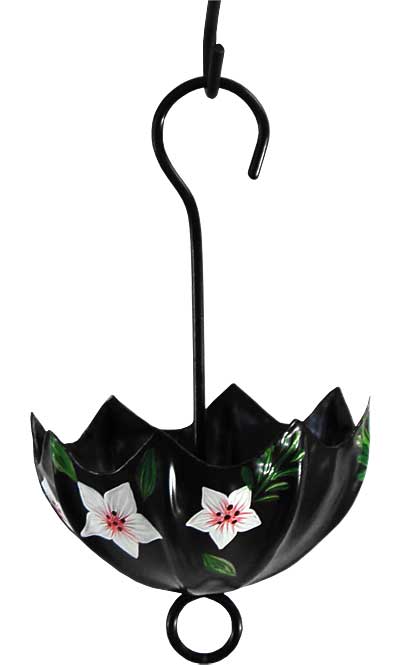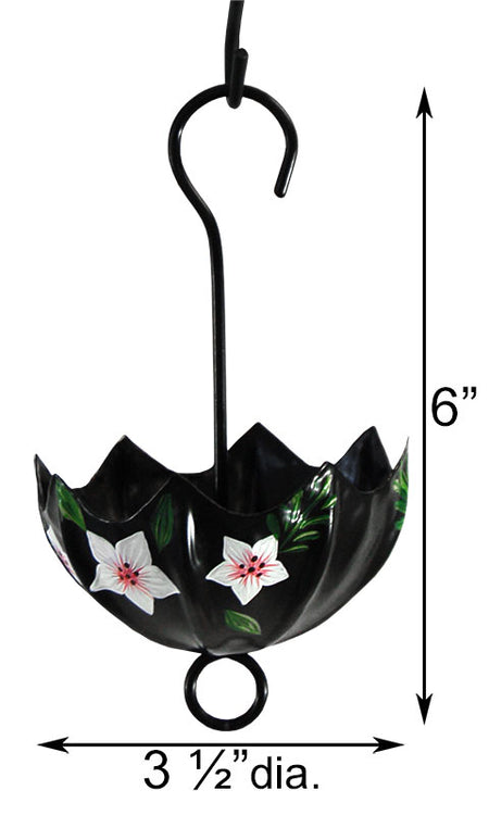 Add a decorative hint to your bird feeder protection with this Parasol White Hibiscus Black Botanica Handpainted Ant Moat. The familiar, inverted umbrella shape, black color, and metal construction form a hardy moat, while the handpainted flowers and leaves capture attention. A scalloped edge and raised ribs lend striking realism to the trap, while the white blooms and green leaves wonderfully contrast the black body. The top hook on this piece allows it to hang from a bracket easily, while the bottom loop and included, 2.25" "S" hook accommodate your existing, hanging hummingbird feeder. Fill this moat with 4 ounces of water to create a natural deterrent. Ants and other crawling insects are hesitant to cross open water and swim, so placing this piece above your feeder easily prevents them from reaching it. The metal construction remains durable and usable for many seasons, and the classic shape offers a whimsical hint. Stylishly deter ants from reaching your hanging hummingbird feeder with this White Hibiscus Black Botanica Handpainted Ant Moat.