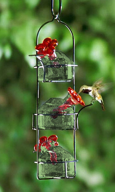 Hummingbirds will surely fly into your yard to dine from the Parasol Lunch Pail Hummingbird Feeder. Reminiscent of old fashioned lunch pails, this tall feeder has three separate reservoirs in a vertical line. Each feeding station has an individual perch for the comfort of your hummingbirds. The lush green vessels blend with your surrounding foliage and offset the black metal frame. The bright red, shatterproof plastic feeding flowers mimic trumpet vine and draw hummingbirds to the feeder. Each hexagonal reservoir is crafted from hand blown glass, and retains some of the style of its artist. The feeder holds 10.5 ounces of nectar, helping keep feed fresh and healthy. Use the included 2.25" metal "S" hook to hang this piece in your garden. Invite "flying jewels" to dine in your yard anytime with the Lunch Pail Hummingbird Feeder.