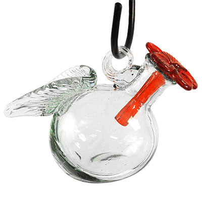 Offer enchanting hummingbirds a fitting feeding station with the Parasol Clear Pixie Hummingbird Feeder. This adorable piece adds whimsy to your backyard in moments, with its rounded shape and flying motif. The clear glass vessel evokes a pitcher, with a flattened base and extended neck. This reservoir holds 4 ounces of nectar, and a red, shatterproof plastic feeding flower inserts into the neck, allowing hummingbirds to dine one at a time. Two wing shapes extend from the back of this vessel, helping the unit maintain its fairy-like form. Textured lines within the wings lend dimension and drama to this piece, attesting to the artistry of its creator. Made from recycled glass, this hand blown vessel brings environmental awareness to your garden as well as style. The glass body cleans easily, while the open neck makes refilling the unit a breeze. Use the included, 2.25" long "S" hook and blown glass loop to hang this feeder from a bracket in moments. Add a storybook look to your backyard with this Clear Pixie Hummingbird Feeder.