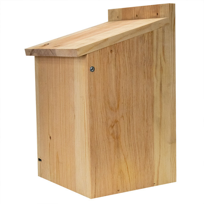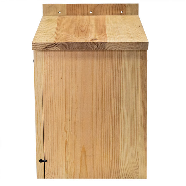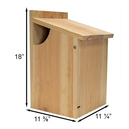 Make squirrel watching part of your daily activities by offering them shelter in this Pine Squirrel Cabin by Prime Retreat. Placing this simple nest box in your yard not only offers these acrobatic animals a safe haven from the elements; its deep design also aids in keeping their young safe. The generous, 18" tall back panel affixes to a wall or tree easily, and the roof angles downward for a classic silhouette. A 3.75" wide and 3.625" tall cut out sits on one side of the nesting box, encouraging squirrels to enter it, and an interior shelf here offers them a place to sit. Open the front panel upward to clean and maintain the home, and twist the metal latch to ensure it remains closed and protected from predators. Angled corners on the base aid in keeping the drey dry, and the natural pine body adds a rustic hint to the yard. The predrilled holes on the top lip enable seamless placement against a flat, vertical surface, while the generous base easily accommodates a mounting bracket (not included) for installation atop a post. Its clean lines and traditional shape make this box a perfect addition to your backyard retreat, and the yellow tone of the pine panels ages over time for a dynamic look. Invite squirrels to lodge in your yard in this Squirrel Cabin by Prime Retreat. Made in the USA.