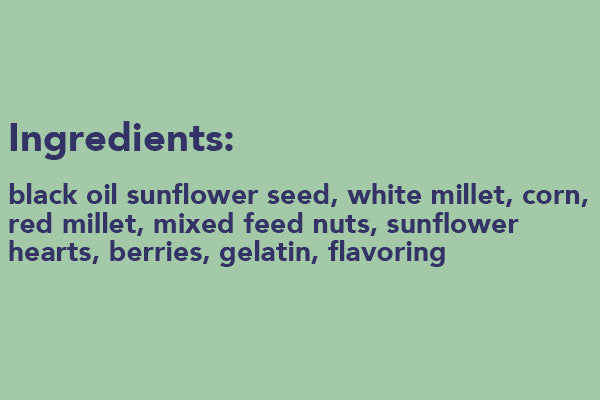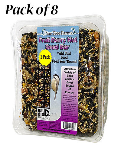 Combine several birds' favorite treats with striking shape and convenience by adding these Pine Tree Farms Fruit, Berry, and Nut Seed Bars to your yard. Offering formed bars to your feathered friends helps reduce seed waste, and these units are made from a blend of seed, nuts, fruit, and flavoring, enticing a variety of birds to dine. This set of 8 cakes makes it simple to place a few throughout your yard, and gelatin helps them retain their rectangular shape. The mixture provides birds plenty of energy and nutrition, and the bars are a great option for use in smaller yards or for those just beginning with birding. Slide the treats into specially shaped seed bar feeders, or rest them on platform feeders for more birds to reach them. Celebrate a new facet of bird feeding by adding these Fruit, Berry, and Nut Seed Bars to your bird garden. Made in the USA.