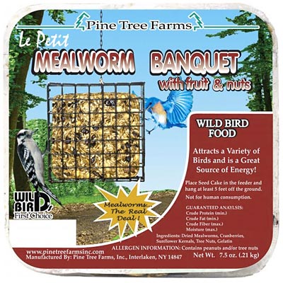 Offer mealworms, nuts, and fruit to your feathered friends in a convenient way using this Pine Tree Farms Le Petit Mealworm Banquet Seed Cake. Some birds, such as waxwings and warblers, prefer mealworms to traditional seed, and this cake makes feeding such a treat simple. A gelatin binding keeps the nuts, fruit, and mealworms in its compact, square form, perfect for placing in standard suet or seed cake feeders. This blend of ingredients provides birds the energy they need to thrive, and the unit may also rest on a tray or platform feeder for several of your feathered friends to enjoy it. Supply bluebirds and thrushes with mealworms in a new way using this Le Petit Mealworm Banquet Seed Cake. Made in the USA.