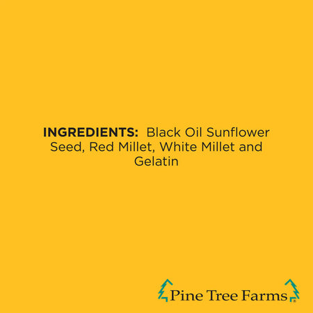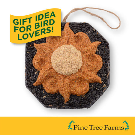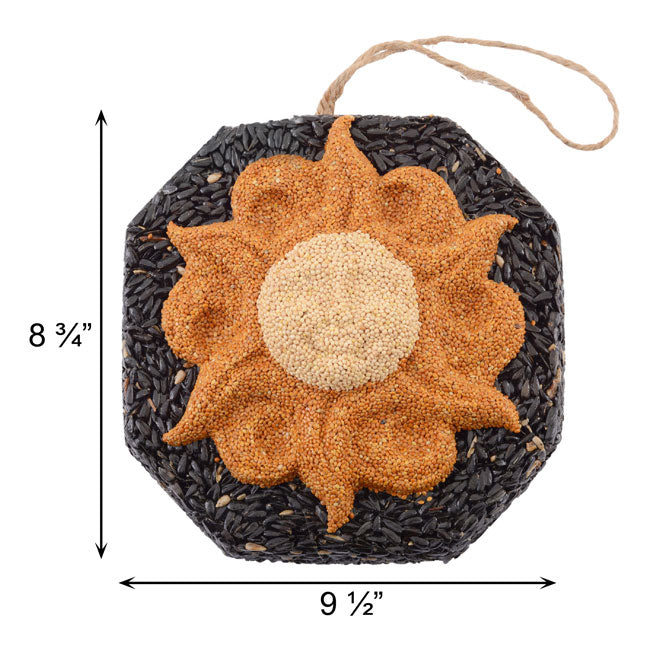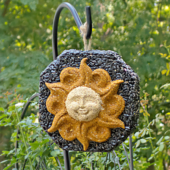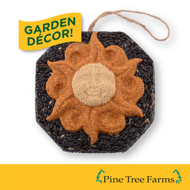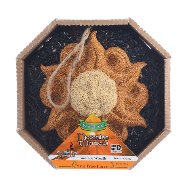 Add a bright look to your bird sanctuary with this Pine Tree Farms Sun Face Wreath. The intricate design and contrasting hues on this seed wreath capture attention in moments, while offering your backyard birds some of their favorite seeds. A red millet sun shape, complete with rays and curves, creates the striking center of this wreath, contrasting the black oil sunflower seed base. A raised, white millet center circle forms a smiling sun face, thanks to raised sections on it evoking cheekbones and a nose. Gelatin throughout the unit helps it retain its shape, and a twine loop at the top makes it simple to hang the wreath. This wonderful unit offers a brilliant alternative to seed feeding, while also bringing a bit of sculpture and design to your yard. Bring a cheerful hint to your bird garden with this Sun Face Wreath. Made in the USA.