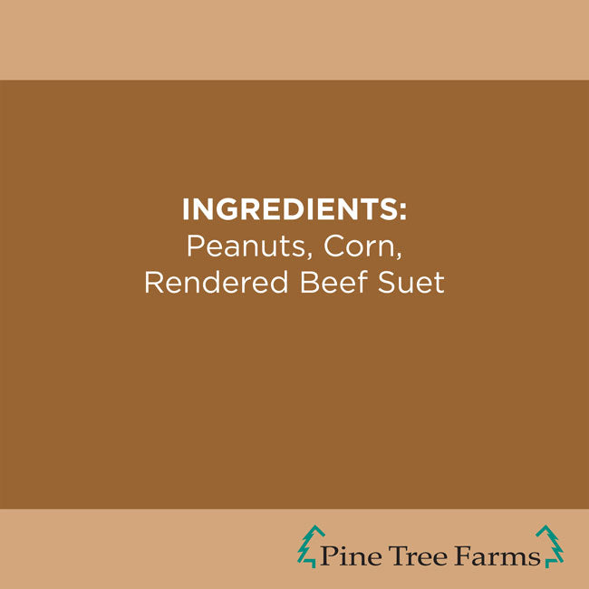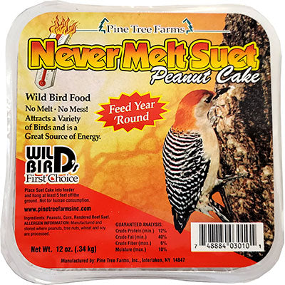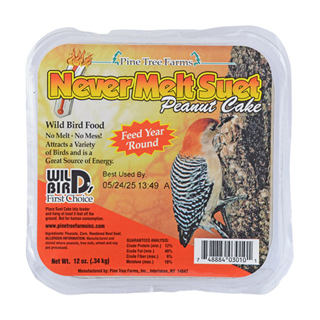 Offer suet even in the spring and summer with the Pine Tree Farms Never Melt Peanut Suet Cake. This convenient cake is specifically designed to withstand temperatures up to 120° Fahrenheit without melting, for use in warmer months. Peanuts and corn will entice the birds, and its wealth of protein helps your feathered friends stay healthy. The cake fits easily into a standard suet feeder. Place several throughout your yard to enjoy birds at every turn. Feed wild birds suet all year using this Never Melt Peanut Suet Cake. Made in the USA.