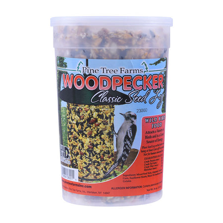 Celebrate woodpeckers in your area by feeding them the Pine Tree Farms Woodpecker Classic Seed Log. This mixture of peanuts, almonds, cracked corn, and sunflower seed offers woodpeckers all their favorite foods in one convenient place. The blend gives birds the nutrients they need to remain active, and its fun log shape makes feeding simple. Place this log into your existing Pine Tree Farms Classic Seed Log Feeder (not included), or rest it on a platform for more options. Gelatin helps the log hold its shape, allowing you to feed birds without the hassle of loose seed. Watch woodpeckers frequent your backyard to feed from this Woodpecker Classic Seed Log. Made in the USA.