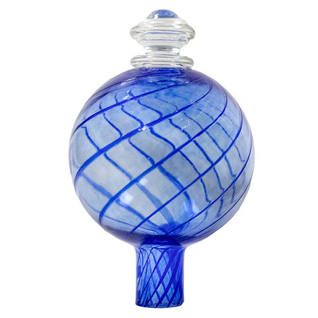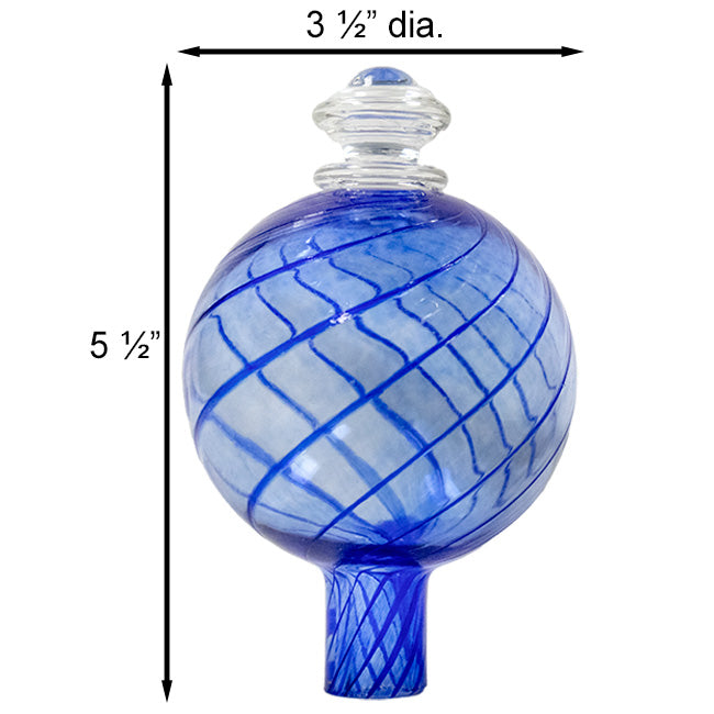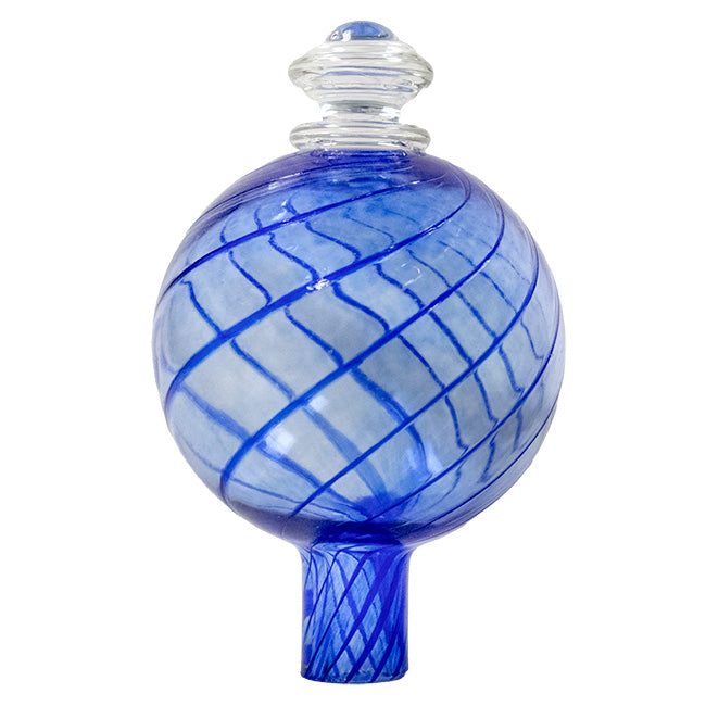 - Top, glass orb sports spiraling, deep blue stripes, a translucent blue background, and clear top finial.