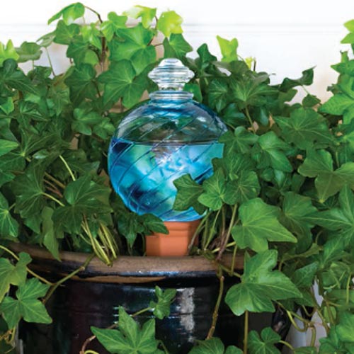 - The varied blue accents on the glass orb contrast the green of your plants for an elegant effect.