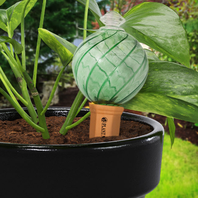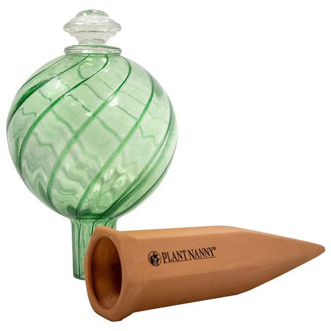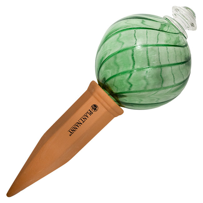 Add a chic and elegant look to your plant watering efforts using this Plant Nanny Green Spiral Watering Globe with Stake.