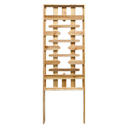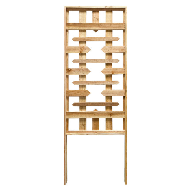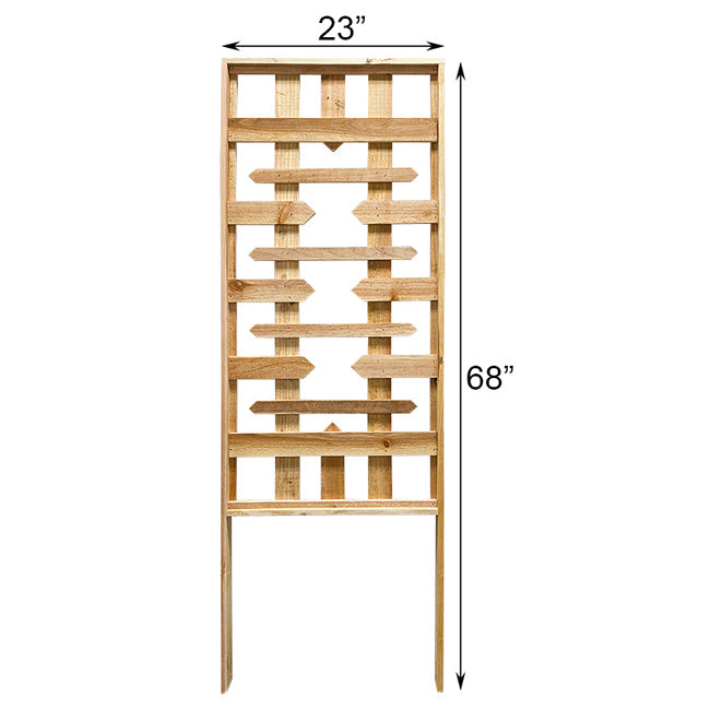 Bring legendary style to your landscaping while supporting climbing plants with this Brown Premium Cedar Camelot Trellis by Prime Retreat. The pointed ends of the horizontal slats on this unit bring the familiar tale of Arthur and his home of Camelot to the forefront of your flowerbed. Not only will this sturdy, handcrafted trellis add a storybook hint to the area; it also provides fantastic support to climbing vines and flowers. Dual, interior vertical slats support the horizontal ones, while the all cedar construction ensures longevity. The intersecting interior rails form gripping spots for tendrils, and the open squares in the center can wonderfully frame a bloom or architectural element. The natural grain and varied brown tones of the hand hewn cedar slats perfectly accent foliage, and the convenient size of the trellis makes it easy to place within your yard. Extended, 19" long legs also aid in quick installation, and heavy duty staples throughout the item offer stability and longevity. Be chivalrous to your plants and support them as they grow upward with this Brown Premium Cedar Camelot Trellis. Made in the USA.