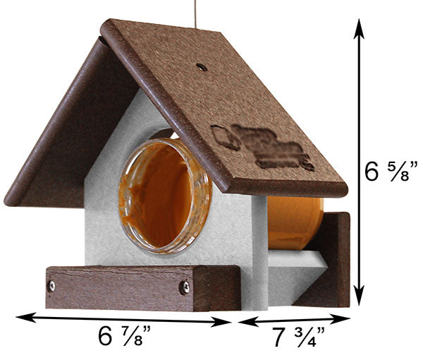 Add peanut butter to the menu for your feathered friends with this Recycled Plastic Peanut Butter Jar Feeder. Recycled milk jugs in striking brown and gray tones create this fantastic piece, while its fun reservoir invites a wealth of wildlife to dine. A classic, pitched roof covers an upright panel, and angled slats extend behind this, culminating in a generous, brown block. Place an 18 ounce jar of peanut butter on this cradle, and align its circular opening with that of the upright. A horizontal, plastic bar across the front of the item provides birds perching area, enabling them to stand and dine on the treat, and small birds can even climb into the jar once more is gone. The overhanging, pitched roof protects the feed from rain, and its deep brown tone meshes with the outdoors. Gray hues on the other parts of the item further its natural effect, and an attached cable makes it easy to hang the piece from a bracket. Hand crafted by the Amish using lasting, recycled plastic and stainless steel hardware, this unit brings a fun look to your yard while decreasing landfill waste. The piece refills easily by removing an empty peanut butter jar and replacing it with a new one, and its unique design will certainly be a garden focal point. Provide a new food to your backyard birds in this Recycled Plastic Peanut Butter Jar Feeder. Made in the USA.
