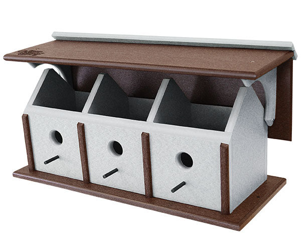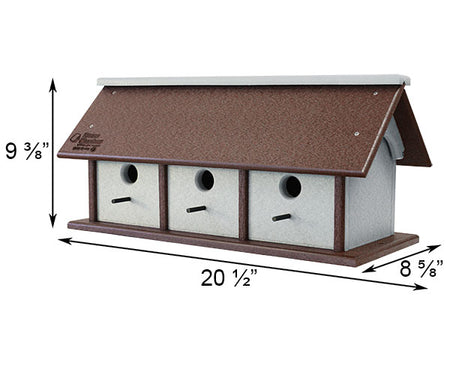 Increase the birding activity in your garden by placing this Recycled Plastic Horizontal Triple Wren House in it. This significant unit is perfect for communal birds, providing three separate nesting spots within one convenient frame. A dark brown, recycled plastic roof, base, and vertical posts bring a natural hint to the unit, while gray side panels offer a bit of contrast. Each of the three front panels has a 1.125" diameter entry hole, for small songbirds to enter and roost, and a perch beneath each circle creates resting spots. The pitched roof ensures the shelters remain both dry and well ventilated, and lifts upward for nest checks and seasonal cleaning. The soft gray hue of the body further prevents birds from overheating, while the flat base allows you rest the unit on a table for a striking display. Add a mounting bracket (not included) for post mounting the piece. Crafted from recycled milk jugs, the shelter brings an environmentally friendly hint to your garden, and the natural tones further the motif. Offer a few small birds shelter easily by placing this Recycled Plastic Horizontal Triple Wren House in your yard. Made in the USA.