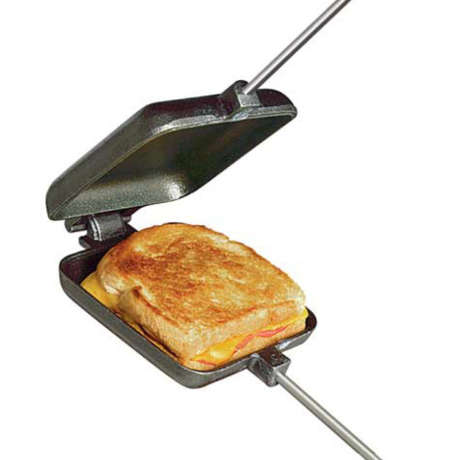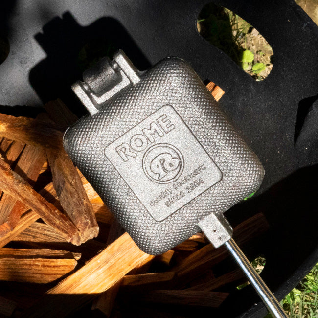 Make delicious, sealed sandwiches over an open fire easily using this Rome Cast Iron Original Square Pie Iron. This sturdy utensil, with its cast iron top, square shape, and lengthy handles, brings a timeless hint to your camping, and will become a welcome tool for years to come. The cast iron of the cooking cavity heats quickly, helping cook sandwiches evenly and with just the right amount of char. The two metal handles help you place the food over the fire without getting too near it, and wooden grips at the base offer a bit of insulation. These handles remain tightly closed thanks to a latch on them, and the unit hinges open at the top to check your food or clean it. Enjoy cooking over an open fire with this Cast Iron Original Square Pie Iron. Ten year warranty.