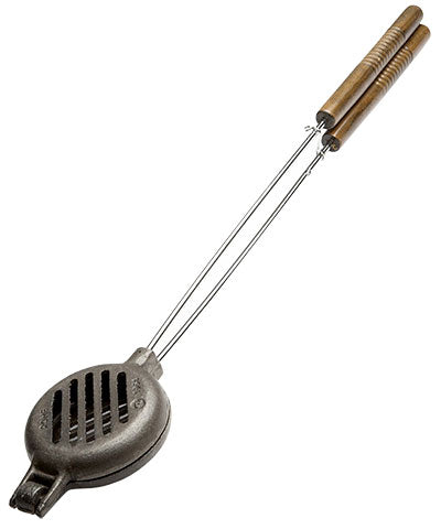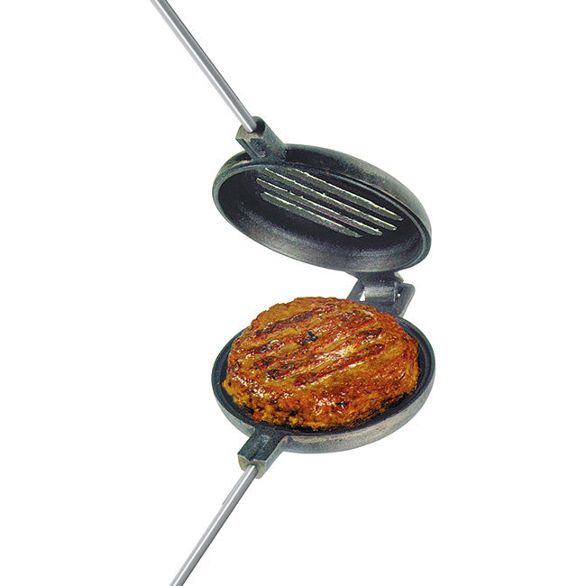 Conveniently cook meat or burgers over an open fire using this Rome Cast Iron Slotted Burger and Meat Griller. The clever design of this unit allows you to perfectly grill beef, chicken, falafel, or even fish burgers cleanly, without the hassle of a traditional grate. The cast iron cavity opens to hold your food, and a latch keeps it securely closed. The durable construction heats evenly and remains warm for quite some time, for cooking both dinner and dessert patties. Slots on the top and bottom of the cavity allow excess grease to drain, and provide direct heat to the food for wonderful char. The cast iron unit can rest directly in your embers, while extended metal handles and sturdy wooden grips keep you safely away from the flames. Enjoy fire grilled burgers with this Cast Iron Slotted Burger and Meat Griller. Five year warranty.