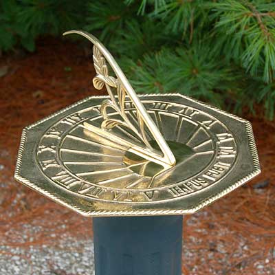 Watch time pass in your garden with the Rome Classic Octagonal Sundial. This intricate timepiece features Roman numerals surrounding the face, with the term "Tempus Fugit" at the bottom, which translates to "Time Flies." A sunburst shape occupies the center of the sundial, and the item finishes with a braided metal accent around the octagonal exterior. The gnomon features a bold flower for added detail. Place this sundial on a Rome pedestal with the included hardware, and ensure that it faces celestial north. The gnomon will cast a shadow over the numbers to indicate the time. The polished brass finish will shine in the sun, and will age to a beautiful patina. Add a stately look to your garden with this Classic Octagonal Sundial.