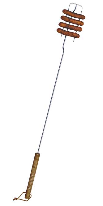 Safely cook up to six hot dogs at once over your campfire with this Rome Safe "T" Fork Reversed Grilling Fork. The clever design of this unit helps prevent accidental punctures, thanks to its inverted tines. This style keeps the tines from harming others, and also makes storage both easier and safer. The 6.75" length of each tine, coupled with the offset shaft beneath them, allows you to cook up to six hot dogs at once, for a meal in no time. Chrome plated metal forms this generous shaft, and a hefty, 9" long, wooden handle protects your hand while cooking. Roast several dogs or metts safely and simultaneously using this Safe "T" Fork Reversed Grilling Fork.