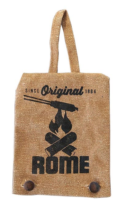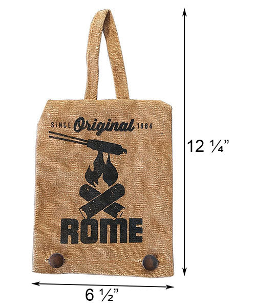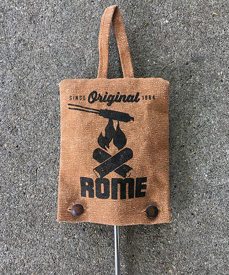 Protect the cast iron top of your favorite pie iron with this Rome Single Pie Iron Canvas Storage Bag. This durable, canvas sack easily fits over the head of a standard round or square Rome pie iron, helping protect it from dirt and damage. Two metal buttons on the bottom of the bag keep it securely closed around your utensil, and a loop at the top enables you to hang it. A rendering of a pie iron over a campfire adorns the front of the piece, and its canvas construction is simple to clean seasonally. Prevent your cast iron cookware from grime or damage with this Single Pie Iron Canvas Storage Bag.