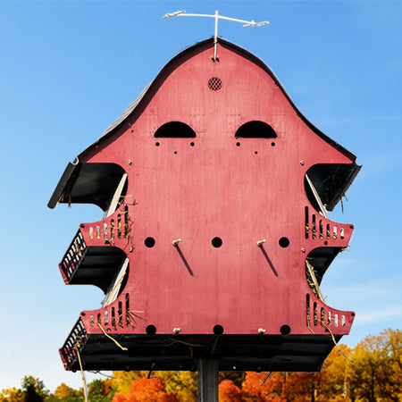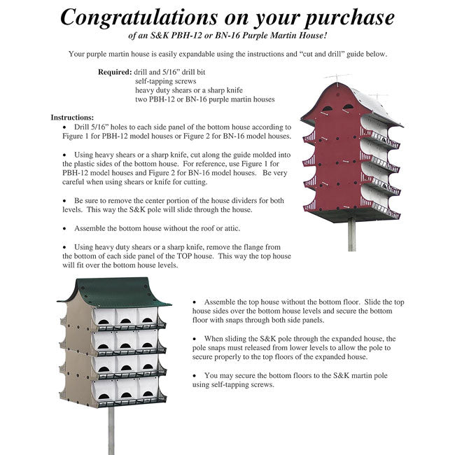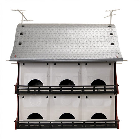 Invite martins to colonize in your yard with the S&K 16 Room Purple Martin House Package. This fantastic package includes everything you need to host a purple martin colony in your backyard. After you finish assembling the S&K Purple Martin Barn, mount it on the included S&K Telescoping Aluminum Pole & Ground Socket, 15', and attach the 2 included Heath Deluxe Purple Martin Decoys to the home. These decoys help attract the beautiful birds, so they can begin using the roost this season. Once the house and pole system has been installed in your yard, read the included Stokes Purple Martin Book to find out how to best attract, house, and care for these wonderful birds. This guide is a fantastic reference book for both the beginning and experienced purple martin enthusiast. This package is ideal for anyone just getting started with purple martins and is a great gift idea. Celebrate martins and offer them a superb home with this 16 Room Purple Martin House Package.