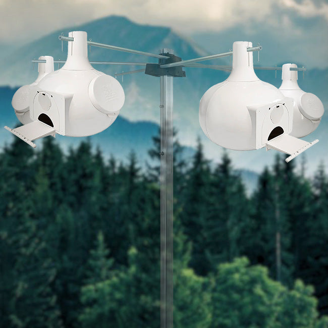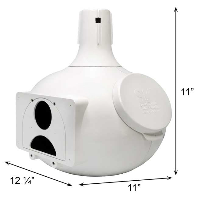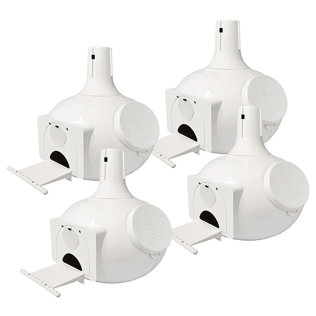 Give purple martins a wonderful set of dwellings in your bird garden with this sleek and stylish Pack of 4 S&K Bo Eleven Plus Purple Martin Gourds. This handy pack contains four expansive, white plastic units, offering migratory martins a cool comfortable nesting site that won't overheat in the summer months. Each expansive gourd presents a 9" deep nesting chamber for martin occupancy, while the dual entry setup of these units gives you the option between round or crescent, starling-resistant entrances. A 3.5" long porch snaps simply into place just beneath each gourd entrance, providing an abundance of perching and landing space for martins coming to the item, while the textured, darkened interior gives these feathered friends a comfortable and easy space to reside without losing their grip. Each item's convenient hanger top easily turns, letting you orient the gourds in whichever manner you wish without repositioning your racking system (not included), while each side oval access port lets you perform periodic nest inspections and maintenance; a cap is included to cover each port when you wish to keep it closed. The gourds' "dry nest" drainage system helps keep each domicile fresh and clean, with gaps in each unit's bottom preventing any accumulated moisture. For maximum variety in your birding efforts, optional door plugs let you cover the larger entrances, and allow you turn them into a 1.5" diameter entry hole suitable for bluebirds, or a 2.25" wide and 0.875" tall oval entrance for sparrows. Hardy, UV-protected, molded plastic construction lets you enjoy these stunning martin abodes as you position them throughout your garden, creating a robust and lively colony you can enjoy for season after season. Expand your purple martin sanctuary and create a stunning focal point in your backyard garden with this Pack of 4 Bo Eleven Plus Purple Martin Gourds. Assembly required. Made in the USA.