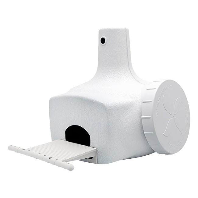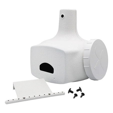 Boost your martin colony with a helpful, starling resistant shelter option using this S&K Bo Plus Combo Purple Martin Gourd. This durable, plastic gourd provides a fantastic shelter option for purple martins in need of a home, and the unit’s lightweight, one-piece body protects these magnificent birds from rain and other outdoor elements while featuring a dark interior to comfort nestlings. The expansive, 9.25” long gourd offers a wealth of interior space for martins to colonize, and a porch is included to easily attach just below the crescent-shaped entry with included hardware, providing 3” of additional, convenient landing space. The entrance’s 2.25” wide and 1.25” tall, crescent-shaped design is specifically meant to deter starlings, letting martins find a location of solace without worrying about invasive behavior; a cover for this entrance is also included for when you wish to close the shelter. A helpful drainage hole sits on the bottom of the gourd, ensuring a dry interior, while a spacious access port measures 4” in diameter to allow handy maintenance and viewing. An included, threaded cap covers this port when you wish, and the raised top of the gourd features a predrilled hole to allow you an easy method for hanging this reliable, staunch item from your birding pole. The tough, textured plastic body makes for a durable but lightweight item in your purple martin sanctuary, and the light complexion of the unit keeps it cool during hot summer days. Give purple martins a fantastic and safe place to colonize when you place this Bo Plus Combo Purple Martin Gourd in your garden. Made in the USA.