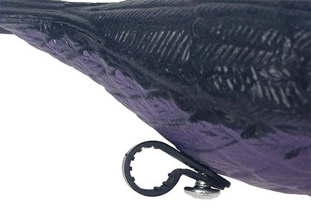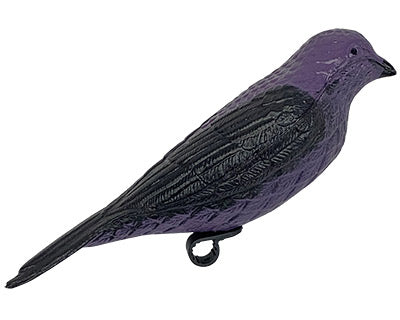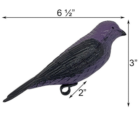 Help attract martins to the gourds or shelters in your yard by placing this S&K Purple Martin Decoy on one. These birds typically roost in colonies, so placing a few decoys around and on your martin houses can aid in attracting them. A purple body and black wings add realistic color to this unit, while individual feather shapes and a split tail design lend it lifelike detail. Its rounded, bottom ring slides onto perching rods up to 0.375" in diameter, or the base can be affixed to a door edge or roof of your existing martin house. The plastic body lasts all season, and the divided tail and purple and black hues perfectly mimic a real martin. Help establish a martin colony in your yard with this Purple Martin Decoy.