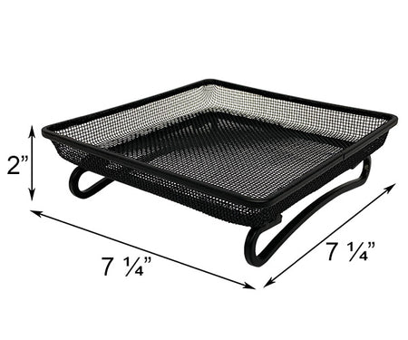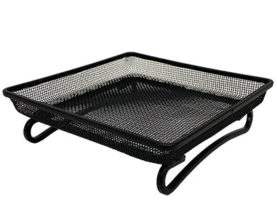 Increase the avian feeding stations in your yard with this Songbird Essentials Deck and Ground Tray Feeder. Placing an open tray within your garden provides ground feeding birds like pigeons and robins a welcome dining spot, and holds a wide variety of food types for several of your feathered friends. Square steel bars create the hardy frame, supporting a fine, powder coated steel mesh screen which forms the reservoir. This open platform holds 0.3 quarts of mealworms, fruit, nuts, seed, or suet, and two curved and slightly arched legs provide both elevation and visual contrast. These legs enable you to rest the unit on a level surface, while the screened body allows plenty of water to drain. The black, powder coated finish protects this tray from wear due to elemental exposure, and the steel body lasts for many seasons. Provide ground feeding birds their favorite treats in this Deck and Ground Tray Feeder.