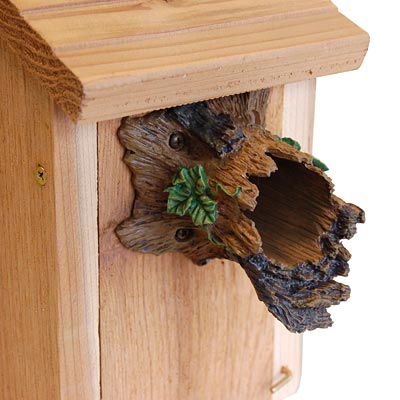 Keep eggs and hatchlings safe from predators by placing the Songbird Essentials Natural Look Bird House Protector on your existing bird house. This hardy, plastic unit lends a natural hint to your bird house, with its brown color, faux bark texture, and green leaf shapes. This protector extends the entry to bird houses with 1" to 1.5" diameter openings, preventing raccoons, squirrels, crows, and blue jays from reaching into the shelter. The four included screws make attaching the item simple, and its wide base can also cover an entry damaged by squirrels or woodpeckers. Place the Natural Look Bird House Protector on your existing bird house to help your feathered friends thrive.