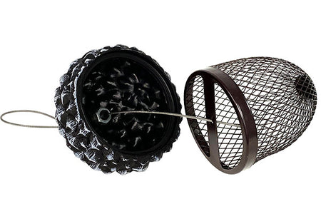 - Metal mesh reservoirs each hold 0.94 quarts of peanut chunks or sunflower seeds