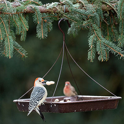 Create a versatile feeding station in your sanctuary with the Stokes Three in One Platform Feeder. The open design of this feeder allows all types of birds to feed comfortably whether the feeder is hanging, placed near the ground, or mounted on top of a pole. A flock of your backyard birds will feed at once from the generous 15.25" by 11.25" feeding platform. Offer mealworms, fruit, nuts, or suet to attract specific birds, or attract all birds by offering combinations of these and seed. The metal base will hold up to 3 quarts of anything you wish to feed. The perforated base of the metal tray provides excellent drainage, helping keep feed dry and fresh, and the included cover grid can be removed if desired. This allows the platform to work as a squirrel feeder, or feed larger birds. The open design makes cleaning or refilling this item quick and convenient. This feeder is crafted from metal and finished in a speckled bronze tone, for an elegant feel. Hang this feeder from a hook or bracket using the included metal hanger, or pole mount it near ground level with the included ground stake. A built-in socket accommodates poles 1" in diameter, enabling the item to be pole mounted (pole not included). Offer a variety of dining options in your birding sanctuary with this Three in One Platform Feeder.