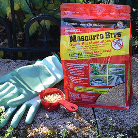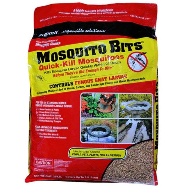 Provide ample protection against mosquitoes on your outdoor property with this expansive and convenient, 20 pound bag of Summit Quick Kill Larvicide Mosquito Bits®. This bag of easy to use, mosquito repellent granules can be spread onto the surface of outdoor water locations where mosquito larvae occur, to provide a simple and effective method for dealing with the presence of unwanted pests on your property. Conveniently add these highly effective pellets to your water gardens, rain barrels, flower pots, and animal watering troughs, providing a wealth of pest protection for your garden or yard and giving you a pleasant outdoor space. Additionally, tend to fungus gnat larvae in your soil with these bits by mixing the granules with water and applying the mixture to your growing surface. These treatments should be repeated for three weeks to deal with troublesome fungus gnat larvae growing in the soil, ensuring you can better foster healthy plants and maintain your mushroom beds without pest problems. This expansive bag covers up to 1.8 acres of property, letting you address mosquito and gnat troubles over a wide expanse of land, and the granules are safe to use around people, pets, fish, and livestock, making it an easy and convenient way to improve your outdoor surroundings. The quick acting nature of this product means it starts killing mosquito larvae within minutes, and the hefty bag allows you to apply the bits to all troublesome areas in need of a boost against nettlesome insects. Keep mosquitoes and gnat larvae at bay and ensure that your whole array of outdoor water receptacles and soil remain well protected with this bag of Quick Kill Larvicide Mosquito Bits®. Made in the USA.