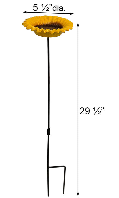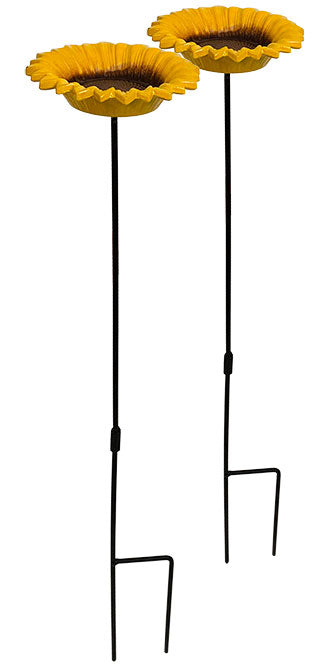 Anchor the corners of your flowerbed with your favorite blooms all year using this Sunflower Staked Bird Feeder Set. This pair of striking tray feeders accurately resembles sunflowers, while each holds up to 0.11 quarts of seeds, suet nuggets, or mealworms. The rim of the 5.5" diameter dish mirrors the yellow petals of a sunflower while the bottom of the feeder features a textured, dark brown surface that mimics the florets in the flower's center. Each feeder's black metal stem makes for a discreet look while disassembling into two pieces, the lower half with a step-in base for simple insertion into the ground. The solid ceramic construction of each dish makes for a durable and long lasting piece that can also hold jelly or fruit, for opening an invitation to orioles to use the feeder. Welcome a plethora of bird species into your garden using this Sunflower Staked Bird Feeder Set.