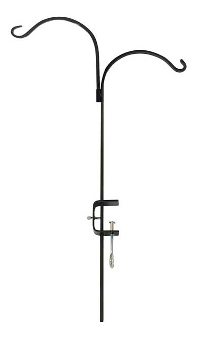 Perfectly hang a flower basket and wind spinner from your deck with The Hookery Adjustable Double Deck Hook with Clamp. Adding this versatile hook to your deck allows you to display your favorite hanging adornment at a custom height, for a personalized look. The straight, central shaft on this unit extends 33" upward, and then forms a 10.25" long hook. This permanently attached, lower hook easily accommodates hanging items up to 20" in diameter, and a square bracket holds the secondary, taller hook for another display. Place the main shaft into the predrilled holes on the included clamp, and use its thumbscrew to lock the unit in place. This innovation ensures a customizable pole, allowing you to raise or lower your items to just the right height. The hefty, metal clamp attaches to wooden deck rails from 0.75" to 3.25" thick, and its large eye hook keeps it securely in place. The black, powder coated finish offsets your hanging adornments, and the steel body will withstand use outdoors for many seasons. Add fantastic hanging area to your deck with this Adjustable Double Deck Hook with Clamp.