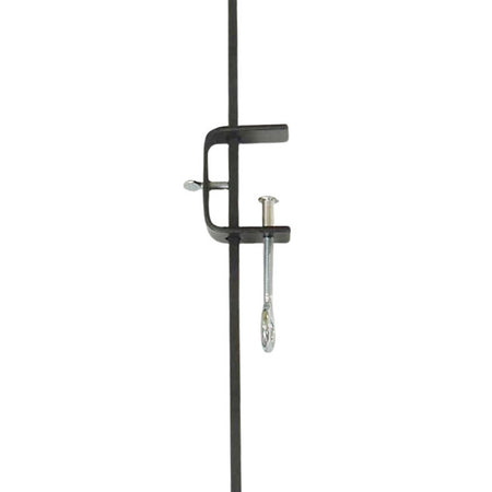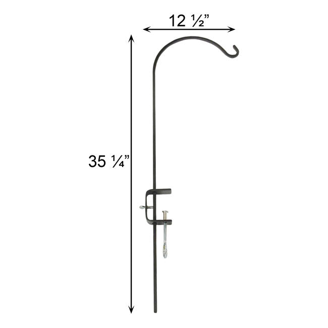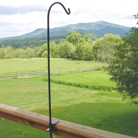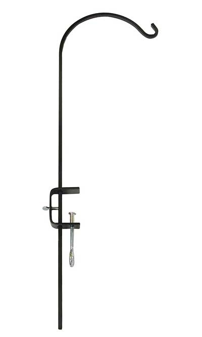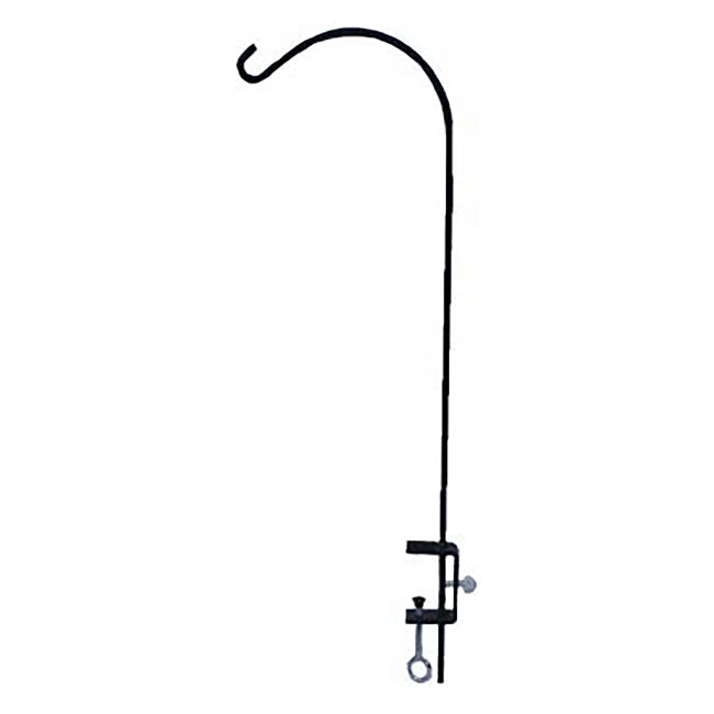 Add a hanging display area to your deck using The Hookery Adjustable Single Deck Hook with Clamp. This hardy hook attaches to a horizontal deck rail easily, and its clever design forms a truly versatile hanger. Its straight shaft extends 31" upward, and culminates in an 11" hook. The upward curl at the end holds your 21" diameter or smaller hanging items, and the square steel body ensures durability. The generous clamp secures onto deck rails from 0.75" to 3.5" thick, with help from the large thumbscrew at the base. The hook's main shaft slides through openings on the clamp, able to be raised or lowered to your liking, and a thumbscrew at the back holds the hanger in place. The all black, powder coated finish blends with your backyard, and its steel construction adds strength and stability. Hang a bird feeder from your deck using this Adjustable Single Deck Hook with Clamp.