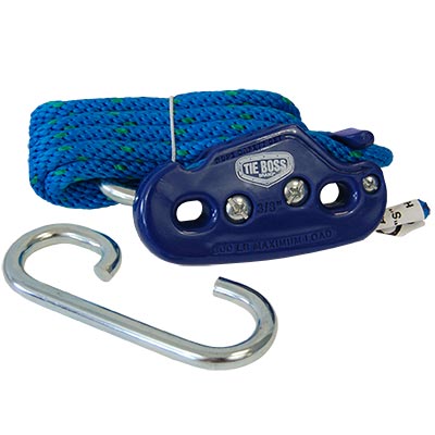 Keep your garage organized or easily secure cargo with this Tie Boss Blue 3/8" Cargo Tie Down and Storage Rope. This hardy unit makes quick and easy work of raising a kayak or bike off of the ground, or suspending a ladder against a wall. A patented, serrated jam cleat on the plastic housing keeps the 3/8", braided polypropylene rope locked into position, and the blue hue of both pieces make them easy to spot in low light. Included top and bottom hooks anchor the assembly to your truck bed, trailer, or garage ceiling, and once secured, each Tie Boss can support a load of up to 300 pounds. The patented design of the housing ensures the rope will not stretch or snap back while in use, and the item is engineered to set, lock, and release with just one hand. Use the Tie Boss to keep a large cooler or tent secure, or use a few to lock your ATV to your trailer. Its streamlined design and hassle-free packaging make it simple to open and begin using the piece, and the blue color keeps the item visible amongst your other outdoor gear. Quick, easy, and durable, the Tie Boss is a fantastic addition to your equipment, and a great gift for the outdoor enthusiast who has everything! Made in the USA. Lifetime warranty on frame and hooks.