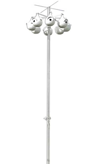 Situate eight of your existing purple martin gourds at a fantastic height using this Troyer's Birds' Paradise Horizontal Gourd Rack for 8 Gourds. This system provides virtually all you need to properly site your existing gourds (not included) for purple martins, while making maintenance convenient. A high tensile, 2" square, aluminum pole inserts into your soil, and a generous, 48" long ground stake provides both strength and stability. Attach the included perch, rack, and pulley to this pole for hanging your gourds horizontally with ease. Nylon glides within the top hub keep the movement of the hub smooth, and the generous polyester rope lowers the shelters with ease. A winder clip keeps the rope in place after the rack has been raised, and the horizontal arms allow each opening to face outward. Perch rods at the top of the pole offer plenty of resting or lookout spots for your feathered friends, while the aluminum construction throughout the item remains durable. Provide a wonderful hanging spot for martin gourds by adding this Horizontal Gourd Rack for 8 Gourds to your yard. Assembly required. Made in the USA.