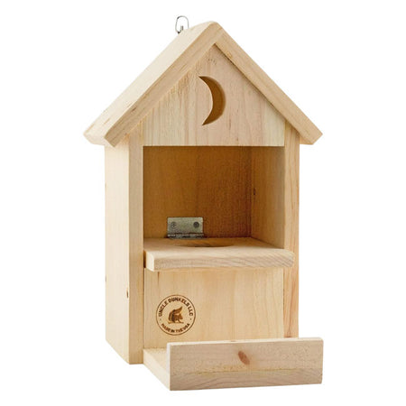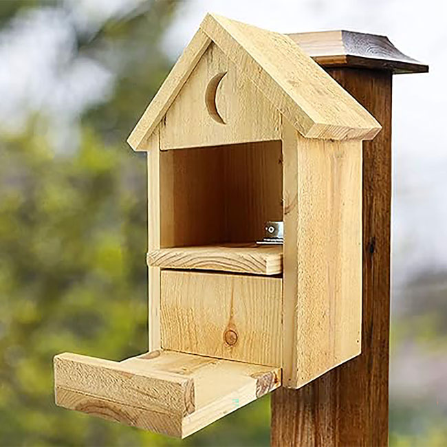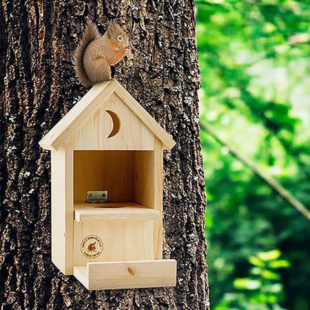 - Squirrels can easily lift this section to reach their treat, while a pitched roof protects the chamber