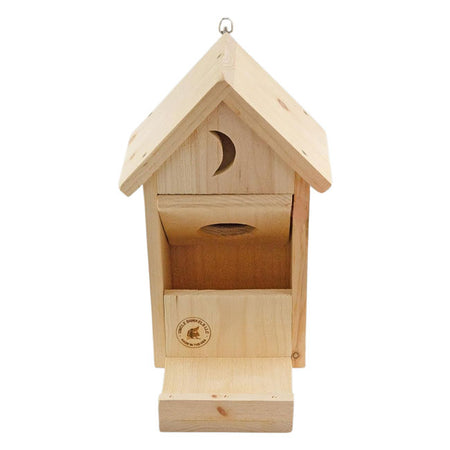 - Whimsical wooden structure evokes a miniature outhouse, complete with crescent moon shaped opening and lifting "seat" lid
