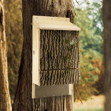 Support populations of a different type of pollinator when you add this Uncle Dunkel's Triple Chamber Bark Clad Bat House to your yard.
